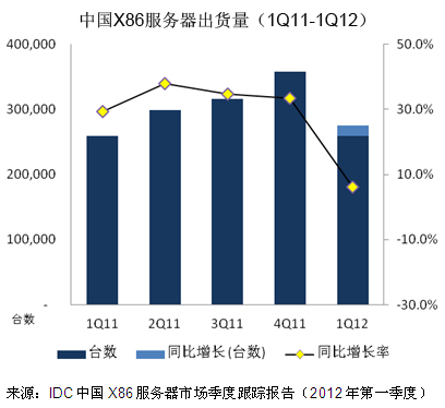 与此同时,X86服务器市场2012年第一季度厂商销售额达到7.95亿美元,同比增长率达到15.6%,销售额增幅远超过出货量增长。从2011年开始中国市场对中高端服务器的需求就有明显增加。X86服务器已经逐渐渗透到企业的核心业务中。IA迁移在多个行业中显示出很强烈的需求。虚拟化,数据库以及Unix到Linux迁移这三种工作负载推动了市场对高端服务器的强烈需求。